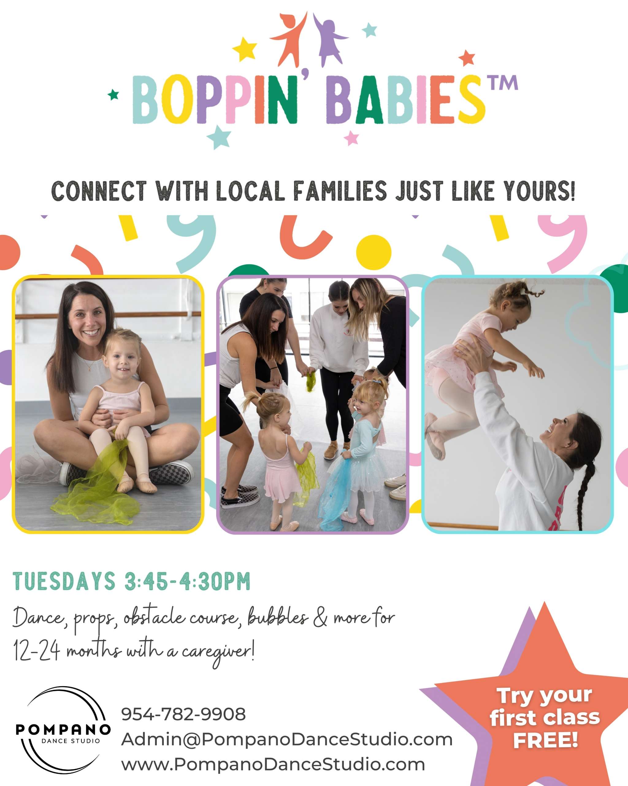 A 45-minute class for dancers age 12-24 months (as of September 1) to enjoy with their caregivers (you don’t have to be a Mommy to join the fun!). Students will have fun singing songs and learning new moves, and each class utilizes props such as bean bags, scarves, and magic wands to hold attention and help with fine motor skills.  We’ll bounce on the trampoline, jump in hula hoops, and chase bubbles, but best of all dancers spend priceless time socializing with peers and bonding with their caregiver!